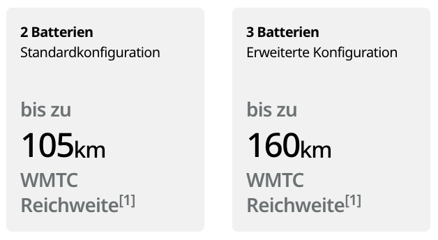 Reichweite (WMTC, geschätzt): Bis zu 110 km (mit zwei Batterien), bis zu 165 km (mit drei Batterien)